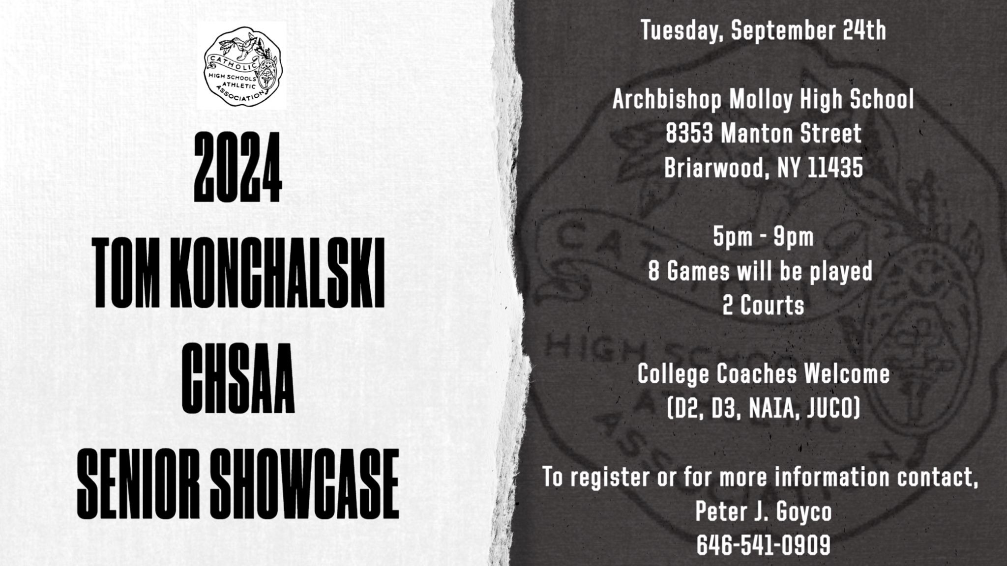 On Tuesday, September 24, RecruitTheBronx.com made it to Archbishop Molloy High School in the Briarwood section of Queens for the annual Tom Konchalski Senior Showcase, which was put together by the CHSAA (Catholic High School Athletic Association). The showcase was designed for players from all 31 schools in the boys portion of the league to play in front of college coaches from D2 and D3 colleges. Below are the standouts from the showcase.